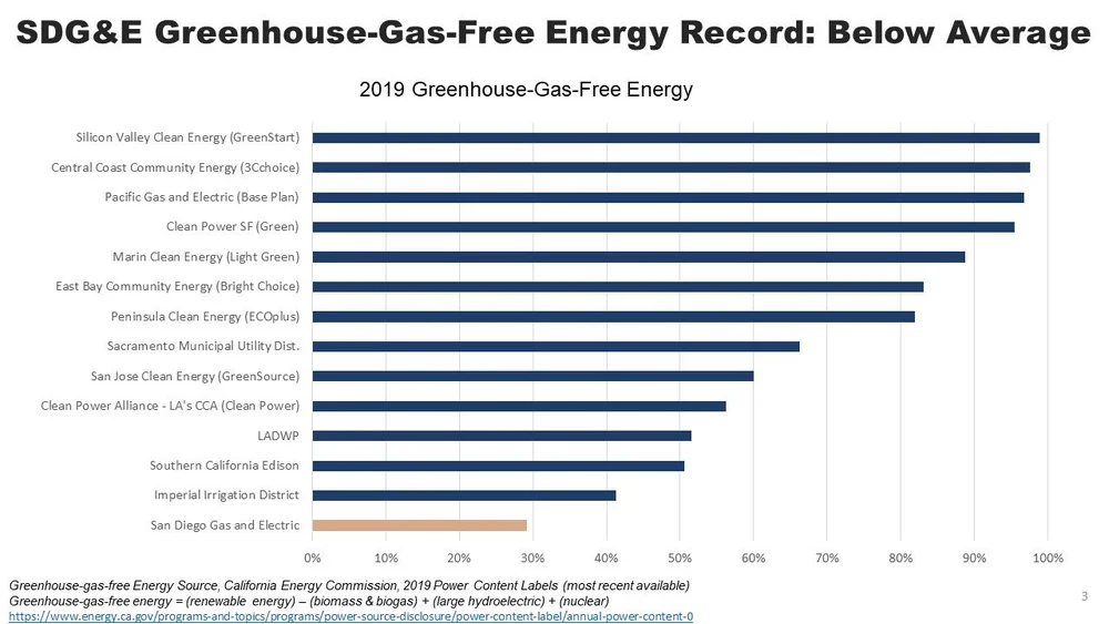 SDG&E provides below-average greenhouse-gas-free energy content compared to other California electricity providers. [Greenhouse-gas-free energy = (renewable energy) – (biomass & biogas) + (large hydroelectric) + (nuclear)]. Source Data: California Power Content Labels as reported by the California Energy Commission.